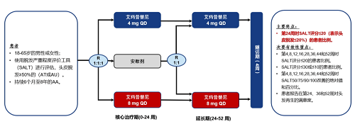 在核心期治疗中,试验组使用硫酸艾玛昔替尼片4 mg/8 mg治疗,安慰剂组使用安慰剂治疗。在24周之后至52周均使用硫酸艾玛昔替尼片维持治疗。研究的主要终点是评价24周时SALT评分≤20(表示头皮脱发≤20%)的患者比例。